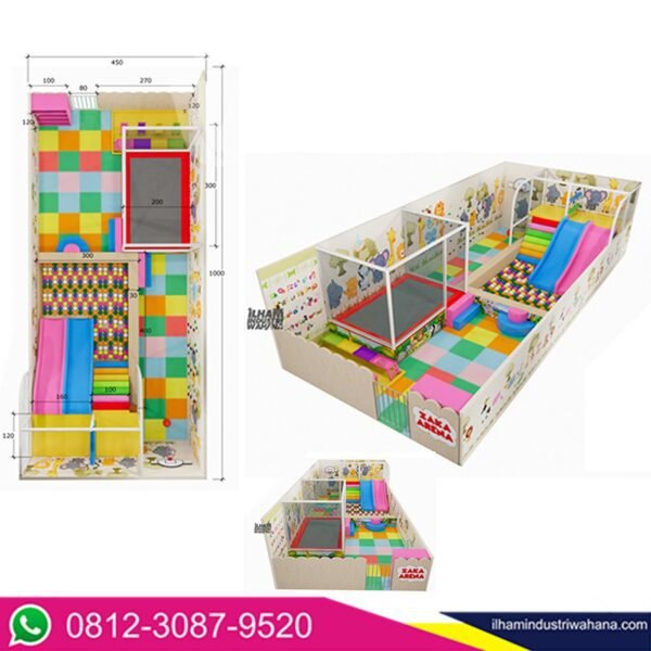 Aksesoris | : tangga, halangan busa, perosotan ring basket, mandi bola, mini boxing trampoline, meja pasir |